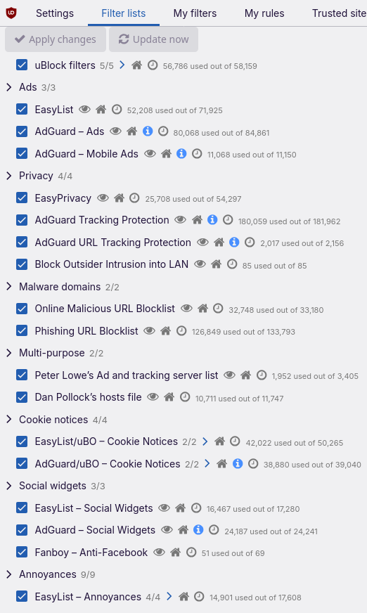 - Go to the filter lists tab and enable whatever you want. The lists are categorised, so if you want to get rid of cookie notices, scroll down a bit and check the boxes. Click the apply changes button and you're good to go.