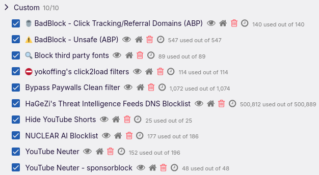 - Hide YouTube Shorts: https://raw.githubusercontent.com/gijsdev/ublock-hide-yt-shorts/refs/heads/master/list.txt